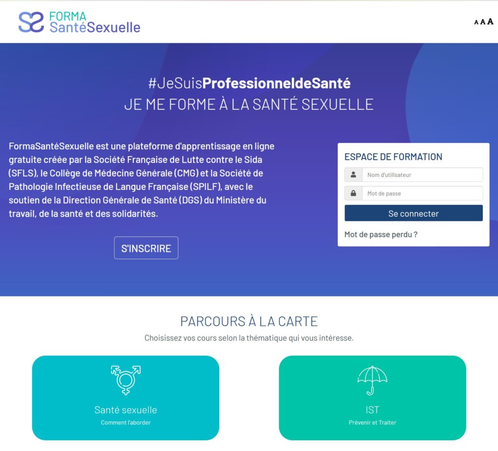 FormaSantéSexuelle est une plateforme d’apprentissage en ligne gratuite créée par la Société Française de Lutte contre le Sida (SFLS), le Collège de Médecine Générale (CMG) et la Société de Pathologie Infectieuse de Langue Française (SPILF), avec le soutien de la Direction Générale de Santé (DGS) du Ministère du travail, de la santé et des solidarités.